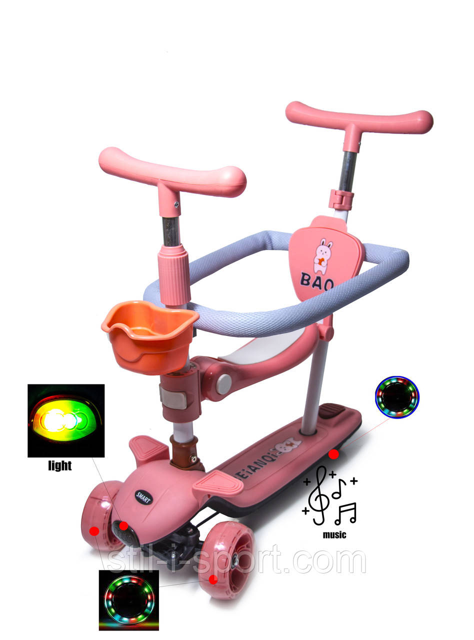 Самокат 5 в 1 Baq з Бортиком, Підсвіткою і Музикою є багатофункціональним транспортним засобом, призначеним для тривалого використання. Ця модель самоката призначена для дітей від 10 місяців до 7 років і має величезну кількість переваг. Спеціально для найменших самокат обладнаний підставкою для ніг на кермі, батьківською ручкою та бортиками для безпеки малюка. За потреби всі деталі можна легко зняти.